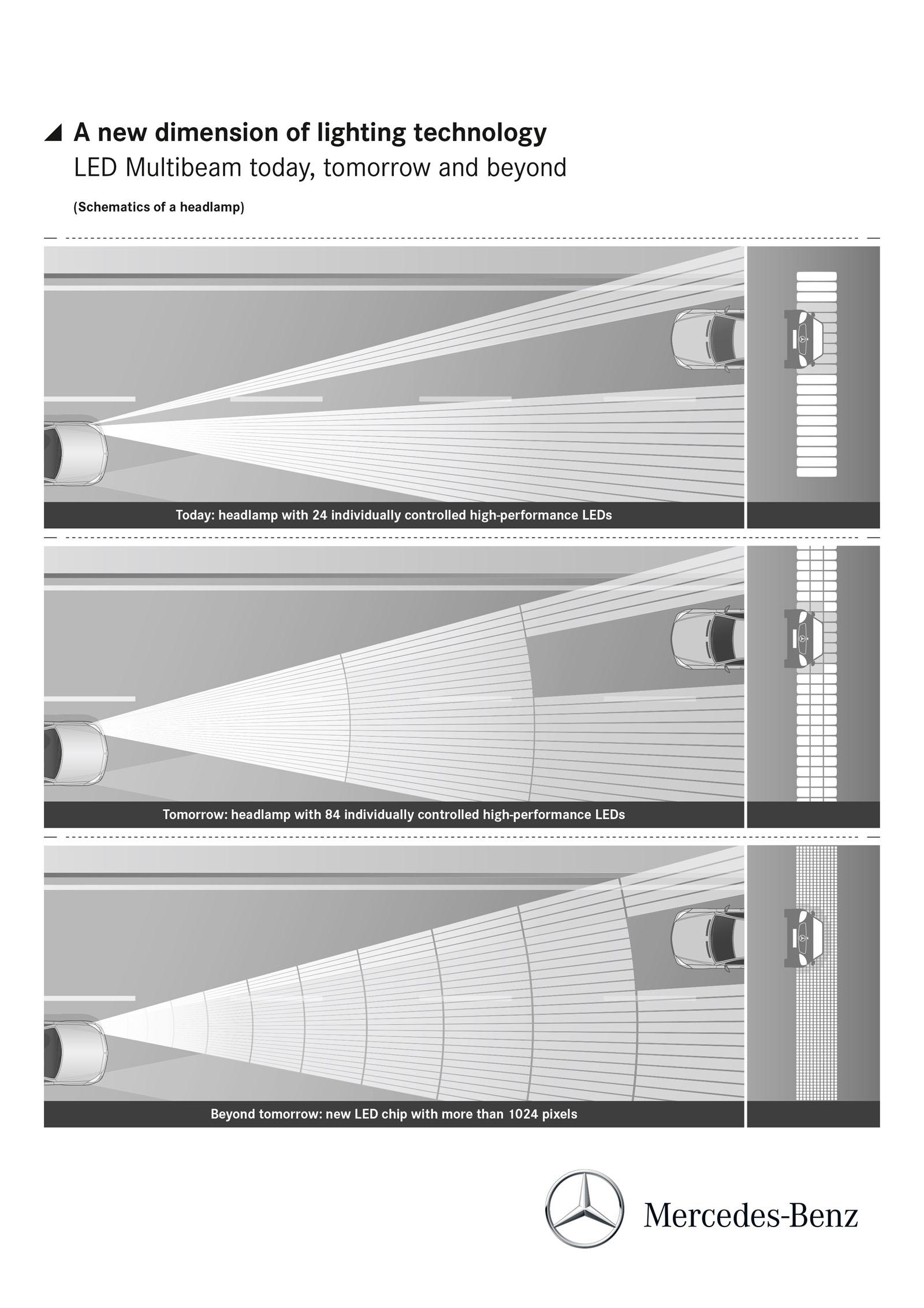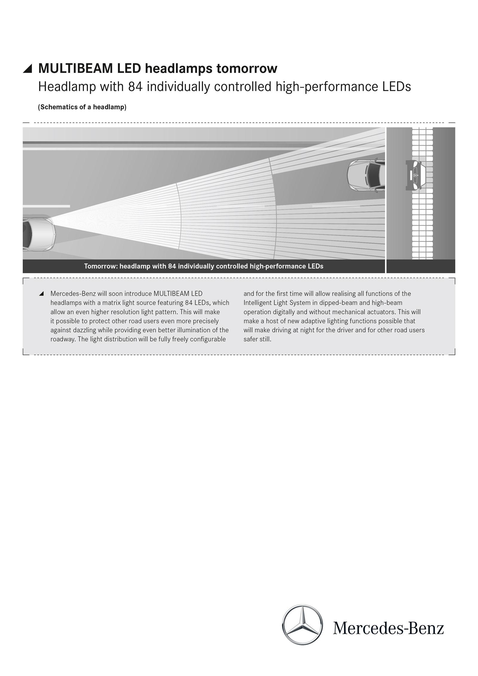 Lazer far teknolojisine ise geçmemekte direten Mercedes, LED teknolojisinin hem daha ucuz hem daha verimli olduğunu söylüyor. Yeni nesil MultiBeam teknolojisinin ilk olarak E serisinde kullanılması bekleniyor.