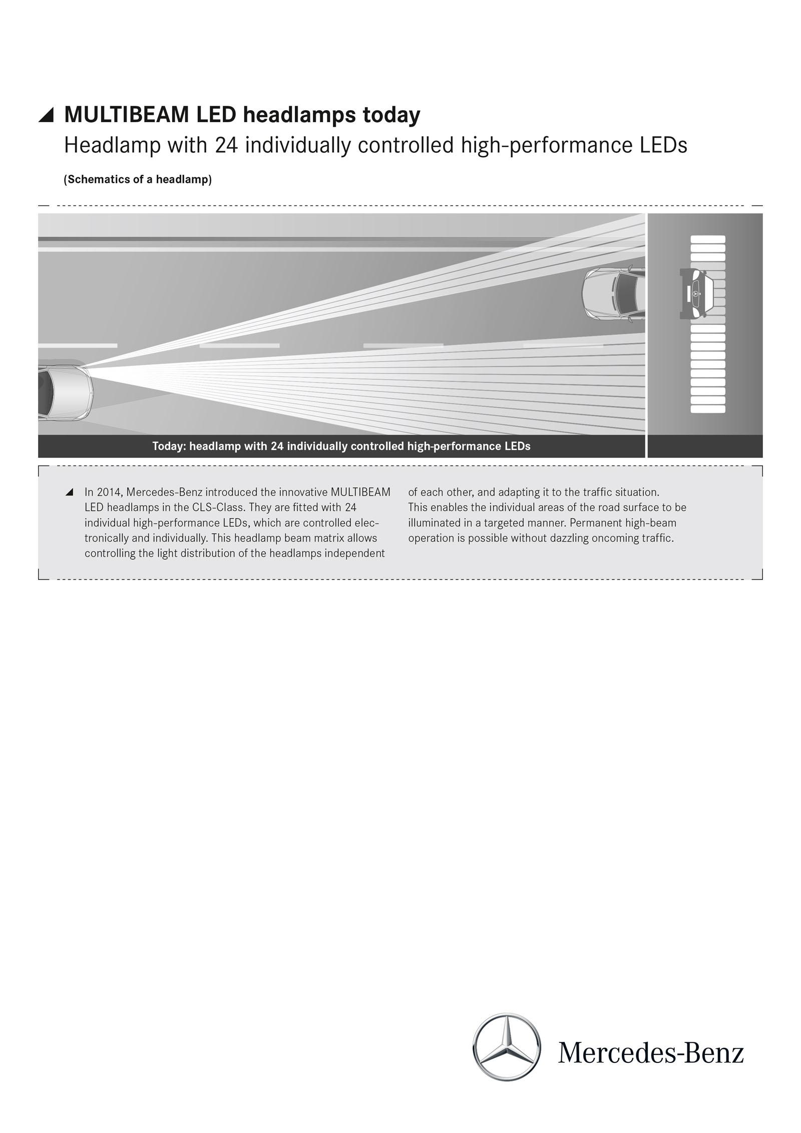 Mevcut araçlarından CLS’ de kullanılan MultiBeam teknolojisini bir nesil daha ilerleteceğini açıklayan firma şuan 24 adet olan bağımsız LED sayısını 84′ e çıkarma hedefinde ve bu hedefle aydınlatma sistemi 600 metrelik bir aydınlatma sağlayabiliyor olacak.