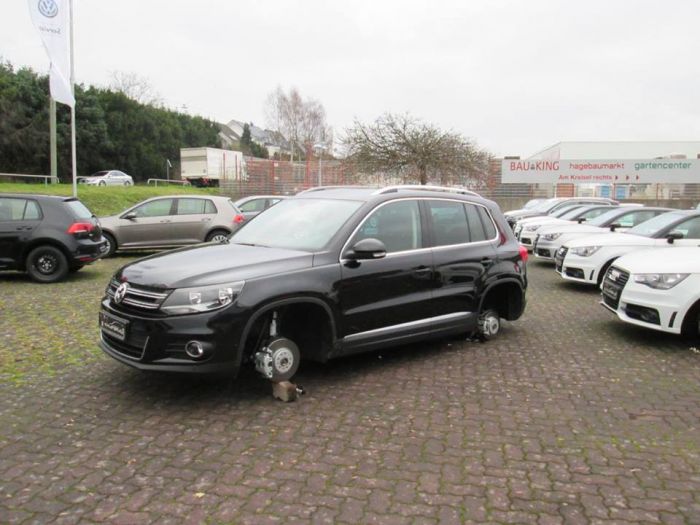 Auto Center Mühlenbruch GmbH çalışanları sabah işe geldiklerinde kötü bir sürprizle karşılaştılar. Jantları çalınan otomobiller fren disklerinin üstünde duruyorlardı.