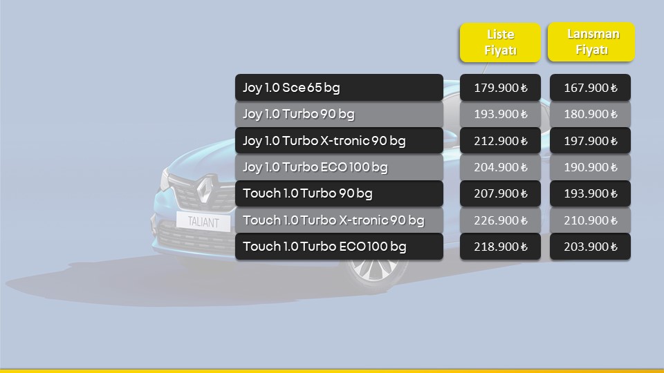 Renault, Taliant modeliyle B-Sedan segmentine şık ve yenilikçi bir yaklaşım getiriyor. Yakın dönemde logosunu yenileyen marka, ürün gamının yeni temsilcisi Taliant’ı hedef pazarlar arasında ilk kez Türk tüketicisinin beğenisine sunuyor. Renault Grubu’nun CMF-B modüler platformunda üretilen Taliant, X-Tronic şanzıman, kör nokta uyarı sistemi, kablosuz Apple Car Play, 8” dokunmatik multimedya ekranı ve elektrikli park freni gibi dikkat çeken özellikleri de beraberinde getiriyor. Model, Joy ve Touch donanım seviyeleriyle tüketicilerle buluşacak.