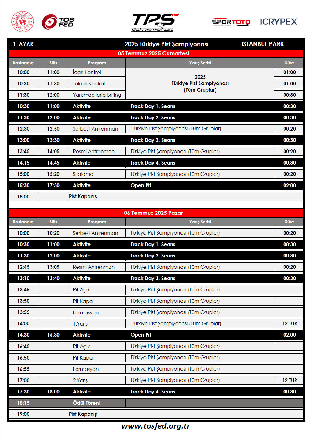 Seyirciye açık ve ücretsiz olarak gerçekleştirilecek hafta sonu, 05 Temmuz Cumartesi saat 12.30’da serbest antrenmanlar, 13.45’te resmi antrenmanlar ve 15.00’de sıralama turları ile başlayacak. 06 Temmuz Pazar günü ise saat 12.45’teki resmi antrenmanların ardından, 14.00’te ilk yarışlar, 17.00’de de ikinci yarışlar koşulacak ve organizasyon 19.00’daki ödül töreni ile sona erecek.