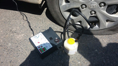 Kompresörü actım, tar tar çalışmaya başladı. Fakat ilk 30 saniye bişey olmadı. Sonra lastik şişmeye başladı, beni lastikçiye götürecek kadar onarılmış oldu. Çünkü yolda giderken pıst pıst kaçırdığını duyuyordum. Sağlıklı bir onarım değildi. Ama bende tüm sıvıyı kullanmamıştım. 500 metre ilerdeki lastikçiye yetecek kadar kullandım. Sıvının hepsini kullanmam gerekirken ben sadece %15 gibi bir miktar kullandım. Lastik 32 bar şişince acele ile söküp lastikçiye sürdüm.