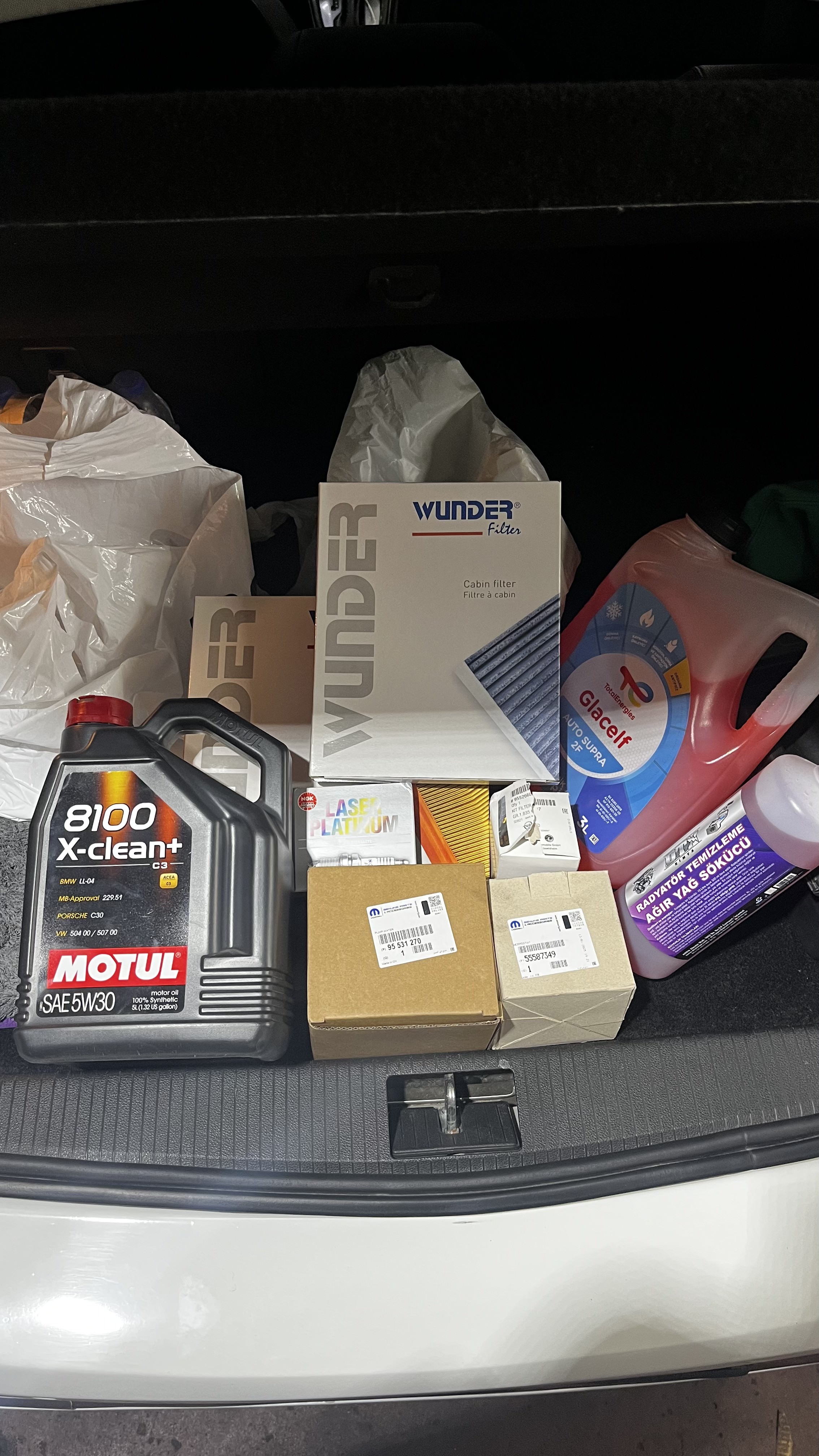 Ankara içi yaklaşık 100km gezdikten sonra akşam kahvemi içip yola koyuldum. Performansı, konforu falan derken hayatımdaki en zevkli ve konforlu yolculuktu diyebilirim. 140-230 arası aşırı keyifli ve lineer bir hızlanması vardı. Gece nihayet eve vardığımda arabanın son kademede fan açtığını farkettim. Eksperde "Termostatta hafif kaçak var baktırırsın abi." dedikleri için zaten az çok tahmin edebiliyordum. Almadan önce yakın bi abimle yaptığım sohbette "Alır almaz buji, bobin ve soğutma sistemini yenileyelim kafan rahat bin." dediği için sorun etmemiştim. Ertesi gün ustama göstermeye gittim, almayı düşündüğüm haricinde bir eksik çıkmadı ve parçacıdan temin edip ertesi gün ustama gidecektim. Bunlarda aldığım parçalar;
