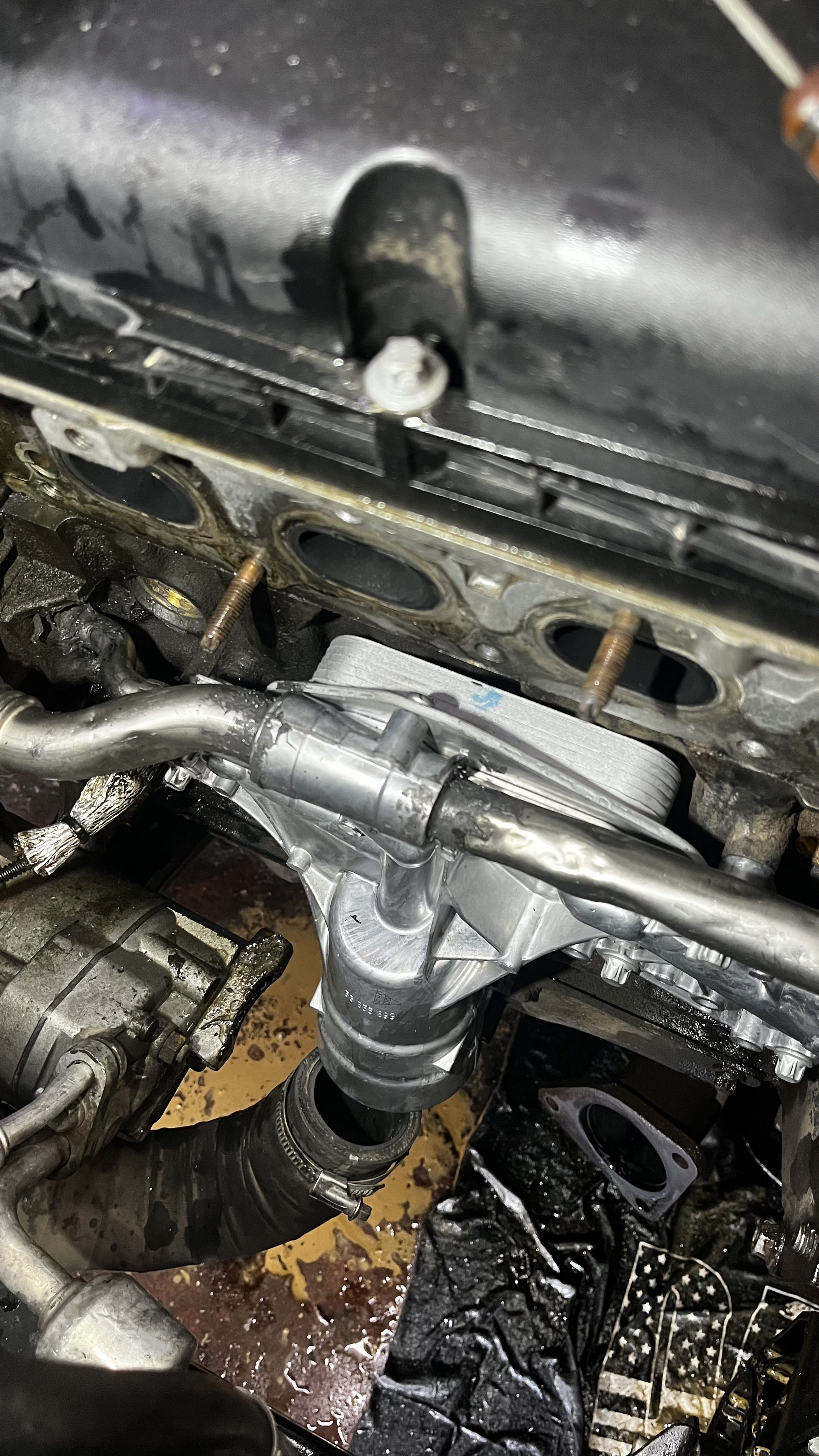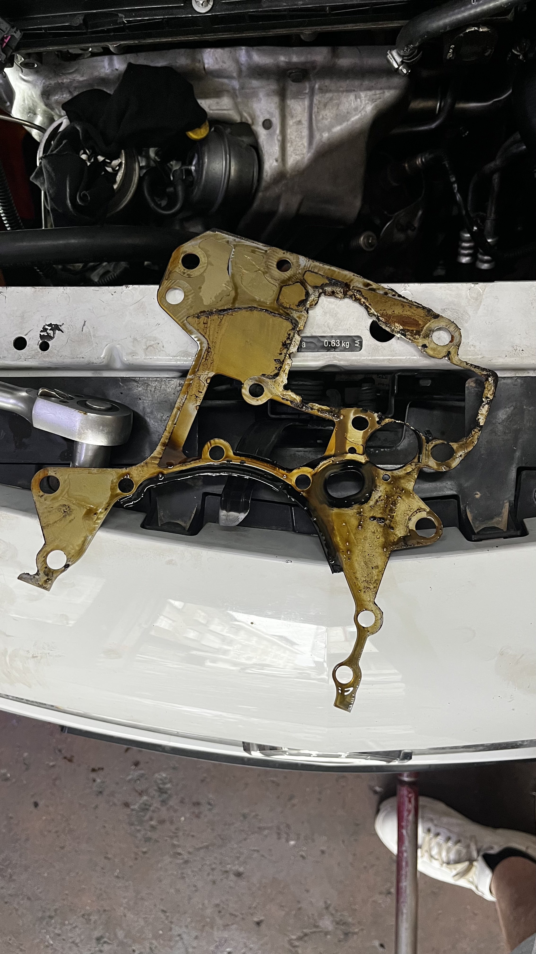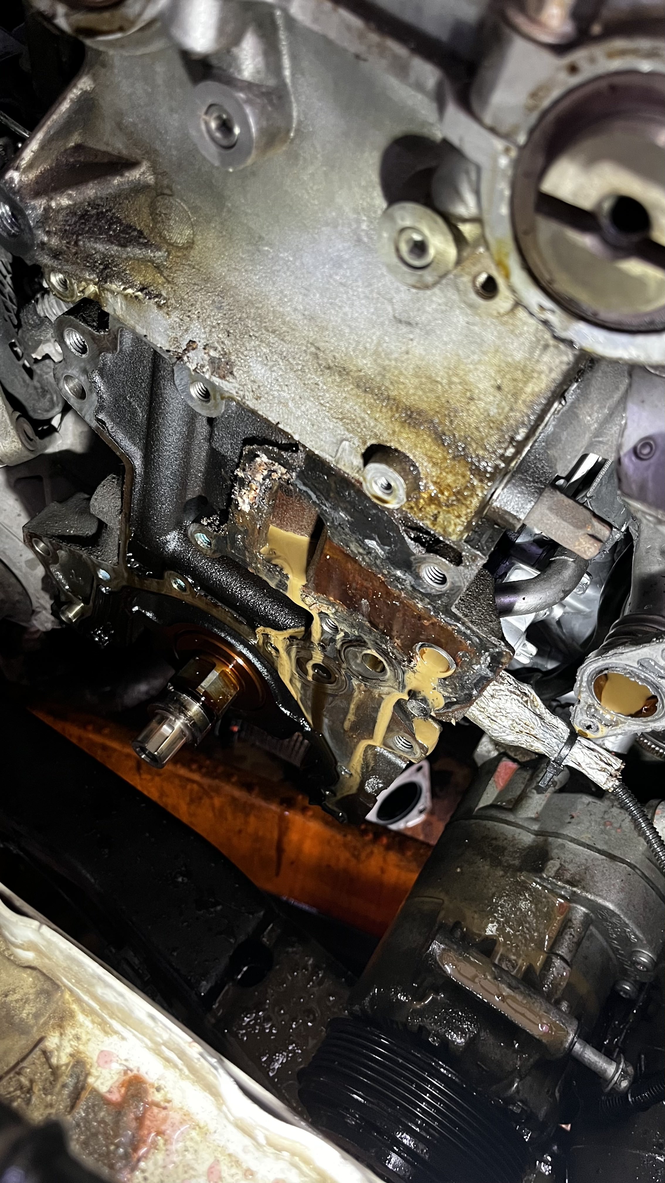 Ustamı aradım, başta beni bulunduğum bölgede bir yere yönlendirmeyi teklif etti ama, ben "HİÇ YAĞ YOK." diyince o zaman çekici gönderelim sana diyip çekici ayarladık ve geri dönmek zorunda kaldık. Yağ soğutucu yeni değişmiş, tüm soğutma sistemi yenilenmiş bir arabada bu durum neyden olabilir diye düşünürken usta pompa contasına bakıcaz %90 ordan dedi. Keza baktığımızda da öyleydi;